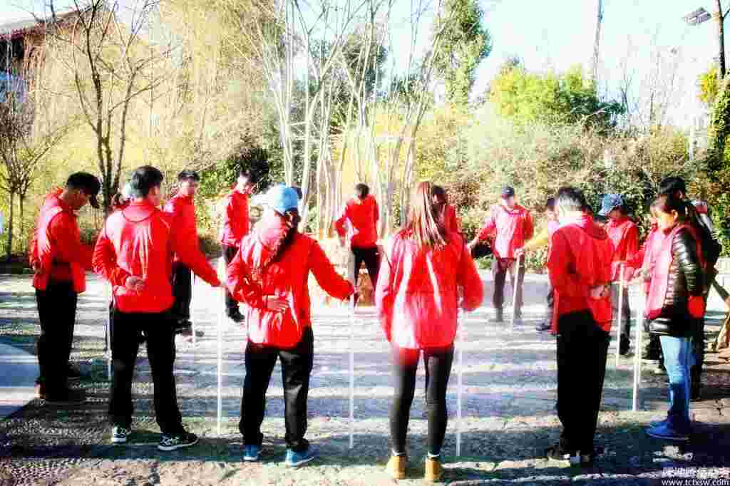 不倒森林,就是參與挑戰的學員圍成一個圓圈,每人拿一根同樣的塑料管,約1.5米,讓棒直立后用右手掌心按住棒的上面,左手放在背后,保持棒直立,在喊“換”時,后一人接住前一人的棒。學員們需要在桿子不著地、不能用手去抓桿子等等規則下去完成一個圓的走動。這是這個拓展項目的基本描述,大家單從文字中似乎覺得很簡單。但是在實際的操作中,會有很多的團隊兵敗在這個項目上,甚至到最后都不明白為什么會失敗。它能培養學員做事的專注能力。