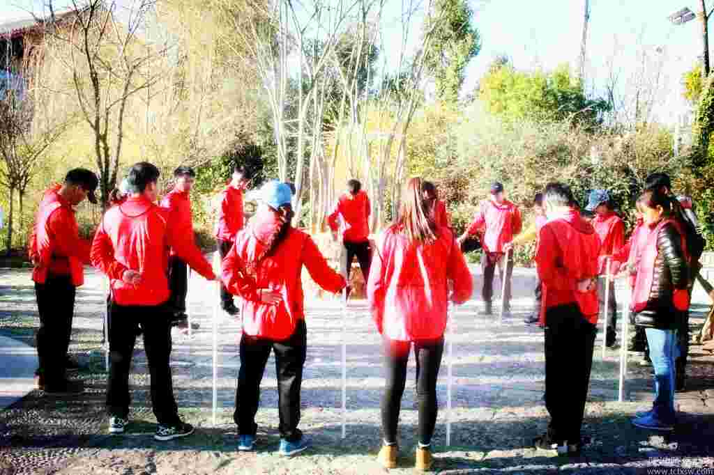 不倒森林,就是參與挑戰的學員圍成一個圓圈,每人拿一根同樣的塑料管,約1.5米,讓棒直立后用右手掌心按住棒的上面,左手放在背后,保持棒直立,在喊“換”時,后一人接住前一人的棒。學員們需要在桿子不著地、不能用手去抓桿子等等規則下去完成一個圓的走動。這是這個拓展項目的基本描述,大家單從文字中似乎覺得很簡單。但是在實際的操作中,會有很多的團隊兵敗在這個項目上,甚至到最后都不明白為什么會失敗。它能培養學員做事的專注能力。